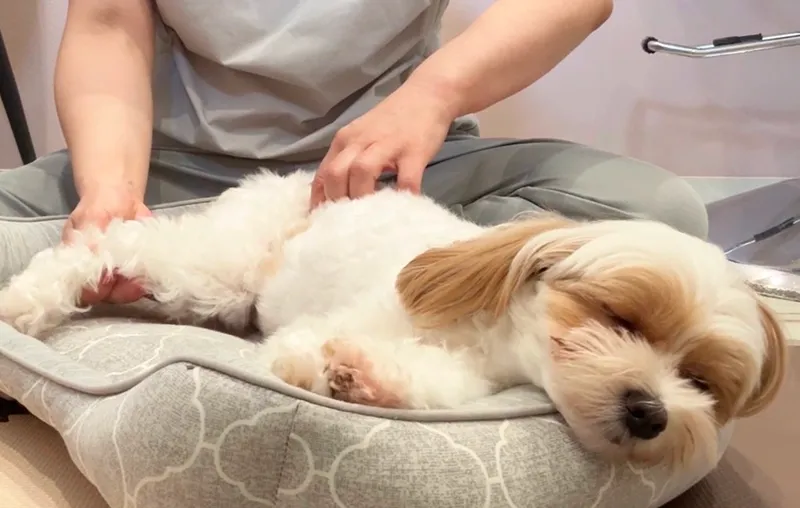 トリミング前にマッサージすることで、トリミングで過度な緊張を抑えることができます。マッサージで、楽な姿勢に導き、負担を軽減するトリミングができます。