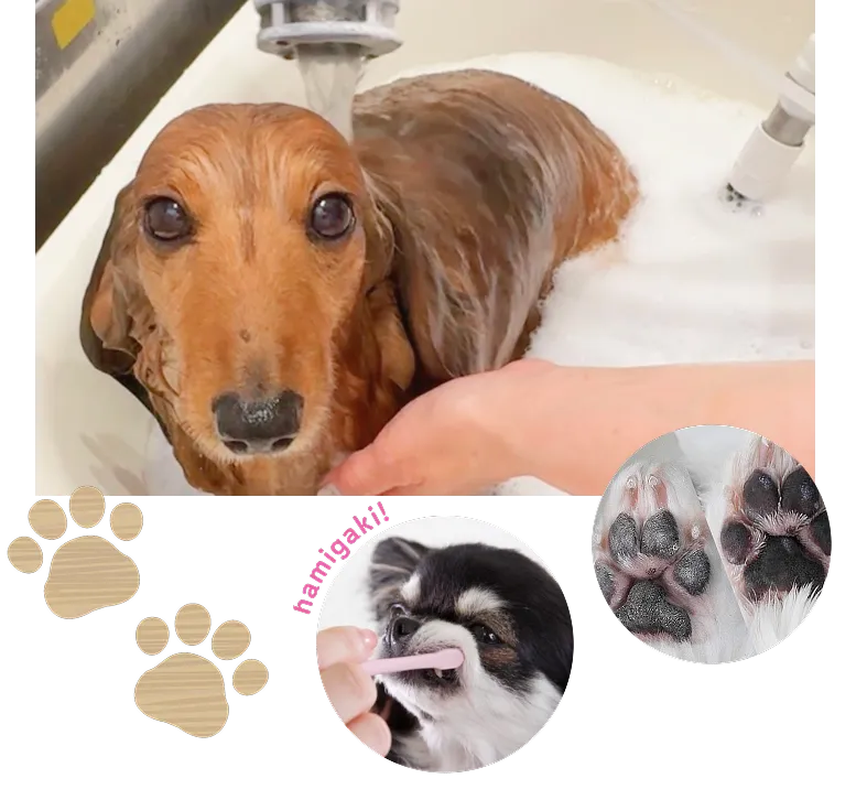全身マッサージ/炭酸泉かけ流し/シャンプー/トリミング/歯みがき/肉球マッサージ&保湿ケア